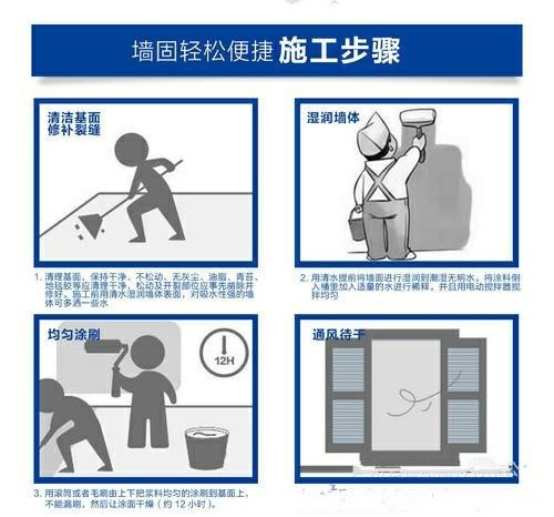 墻固施工流程:檢查維修墻地面,解決開裂空鼓等問題。清理干凈墻面,調制好墻固涂料,由高到底進行滾涂施工,眼觀檢查,覆蓋率99%即可。干燥后方可進行后續施工,墻固施工完成未干燥時不可進行灰塵作業。